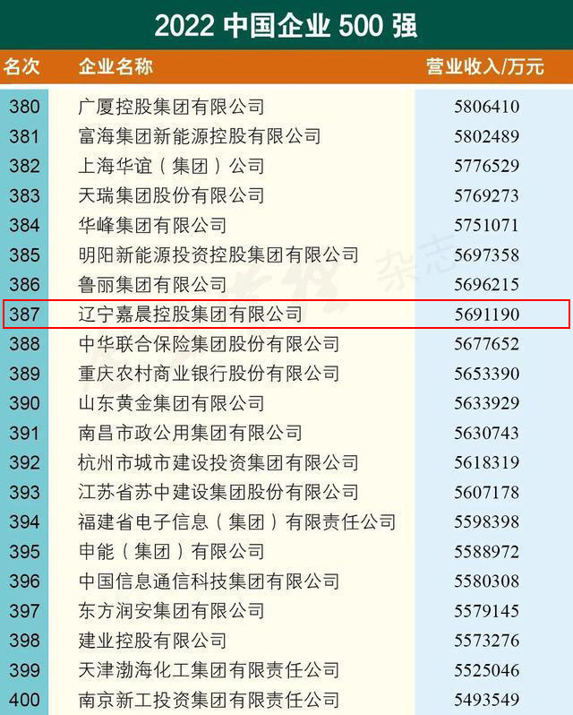 9月6日,中國企業聯合會,中國企業家協會在京發布了“2022中國企業500強”榜單,遼寧嘉晨控股集團榜單排名387位。今年是“中國企業500強”榜單自發布以來入圍門檻絕對值提高最多的一年。
